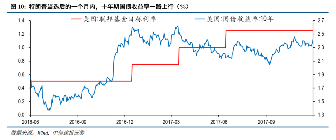 2016 年大选前,民调结果大多显示希拉里(Hillary Clinton)领先特朗普(Donald Trump),但最终败北。而比起总统大选结果的反转,更超乎市场预期的是共和党在参议院、众议院也获得多数,这意味着中期选举之前共和党推行政令的强大权力。资本市场对当时超预期结果作出反应,市场开始集中消化对特朗普的减税、关税等政策主张的影响。