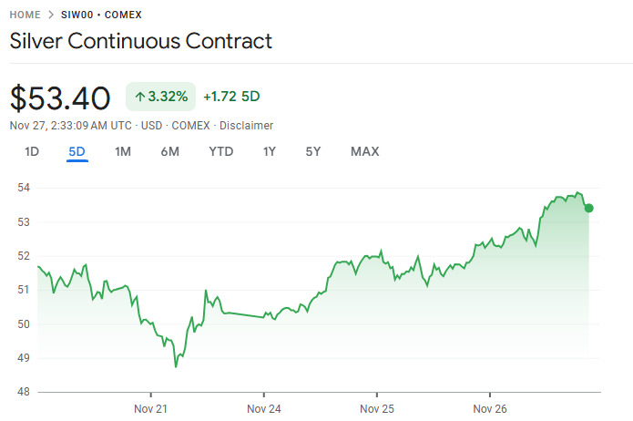 11 月 26 日至 27 日,白银(XAG/USD)周三大幅上涨,盘中交易价格约为每盎司 52.45 美元,日内涨幅达 2%。受美国国债收益率持续走低及投资者转向无利息资产的推动,白银延续近期上行趋势,市场看涨情绪明显升温。