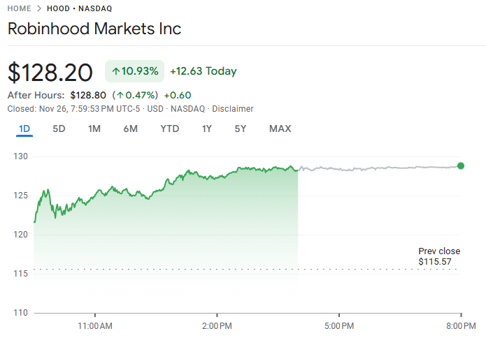 11 月 26 日至 27 日,线上券商 Robinhood(HOOD)周三股价大涨 10.93%,因公司宣布将扩大快速成长的预测市场业务版图。