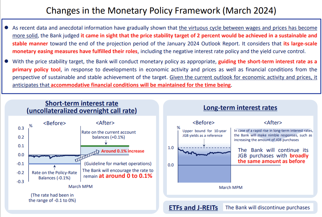 3 月 19 日,日本央行宣布最新利率决议,将基准利率从 -0.1% 上调至 0-0.1%,为 2007 年以来首次加息,结束了长达 8 年的负利率时代。与此同时,日本央行结束收益率曲线控制(YCC)框架,声明中不再提及引导长期利率至 0% 左右,并取消对日股 ETF 和 REITS 的购买计划。