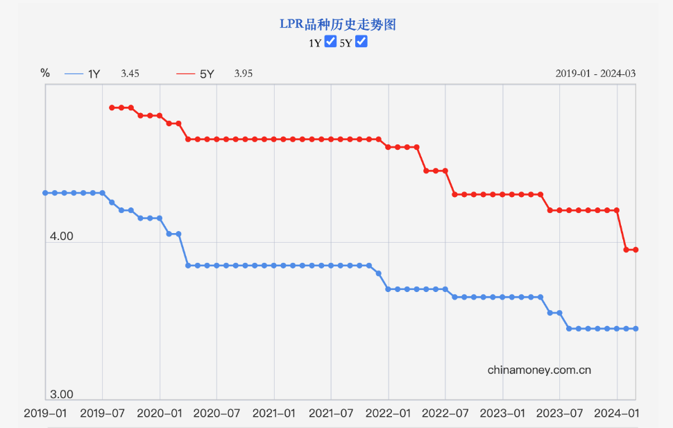 2024 年 LPR 报价已进行了三轮,其中 1 月 LPR “按兵不动”,1年期 LPR 为 3.45%,5 年期以上 LPR 为 4.2%,均与前期持平;2 月 LPR 报价中,1 年期 LPR 为 3.45% 未变,但 5 年期以上 LPR 为 3.95%,下调了 25 个基点,这也是 5 年期 LPR 调降幅度最大的一次。