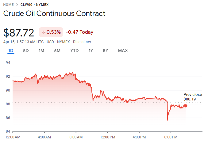 国际油价大幅下跌,市场出现迹象显示美国与伊朗正积极谋求安排第二轮和平谈判,缓解地缘政治紧张局势。布伦特原油期货下跌 4.6%,收于每桶 95 美元以下;西得克萨斯中质原油(WTI)跌幅更大,达到 7.9%,报每桶约 91 美元。