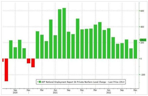 美国自动数据处理公司 ( ADP )数据的表现也支持了美联储 12 月会议纪要所表达的核心观点,即全球最大经济体的劳动力市场状况正在加剧工资和物价的上行压力。数据显示去年 12 月美国私营部门就业人数增加了 23.5 万人,不仅远高于此前市场预期的 15 万人,也几乎是 11 月 12.7 万人的近两倍。这些数据表明,劳动力市场虽然在某些方面有所降温,但整体仍然强劲。尽管担心衰退即将到来,不过对劳动力的需求仍然远远超过供应,继续给薪资带来上行压力,为消费支出提供了支撑。此外,裁员仍保持在极低水平,职位空缺数居高不下。