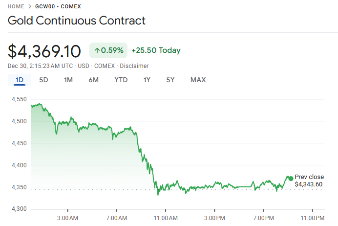 贵金属市场周一(12 月 29 日)出现剧烈回调,黄金价格单日暴跌逾 200 美元,白银与铂金亦自盘中创纪录高位急转下行,显示投资者在前期强劲上涨后集中获利了结。