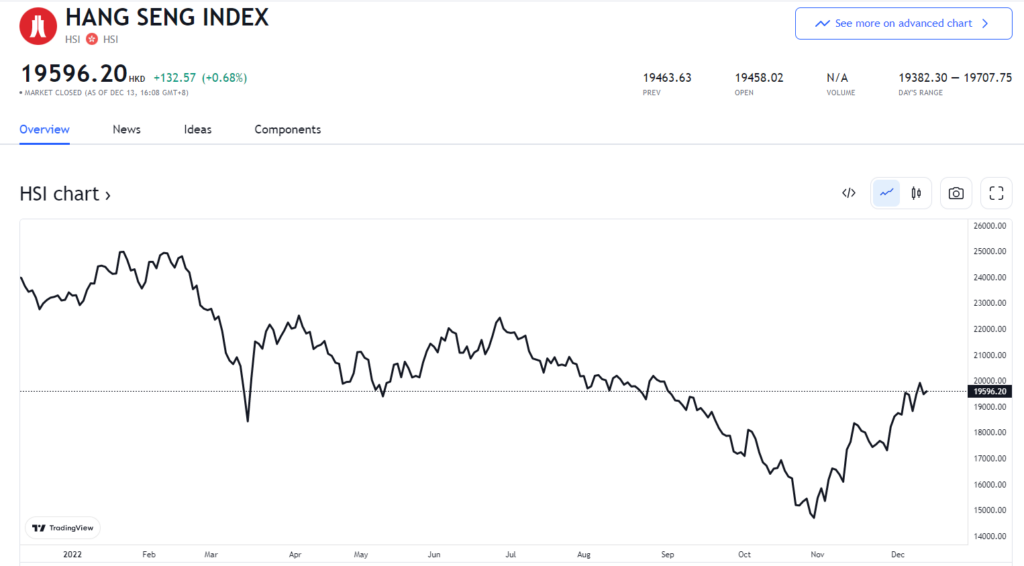 近期多重利好因素提振港股,如美联储加息节奏放缓 、经济复苏吸引外资、互联网公司业绩提升等,11 月港股集体暴涨,恒生指数大涨 26.62%,为 2000 年以来恒指涨幅最大的一个月,加上 12 月的涨幅,恒指的涨幅更是能达到惊人的 32.52%,领跑全球主要市场。