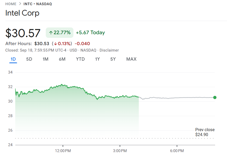 英特尔获英伟达注资 50 亿美元,股價漲超 22%