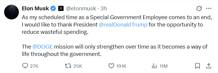 他在 X 社交平台上发文称,在他作为特别政府雇员的任期即将结束之际,他想感谢美国总统特朗普给予的减少政府浪费性支出的机会。”随着我作为特别政府雇员的预定时间结束,我要感谢特朗普总统给予我减少政府浪费开支的机会……DOGE 任务将随着时间推移只会变得更加强大,因为它将成为整个政府的生活方式,”