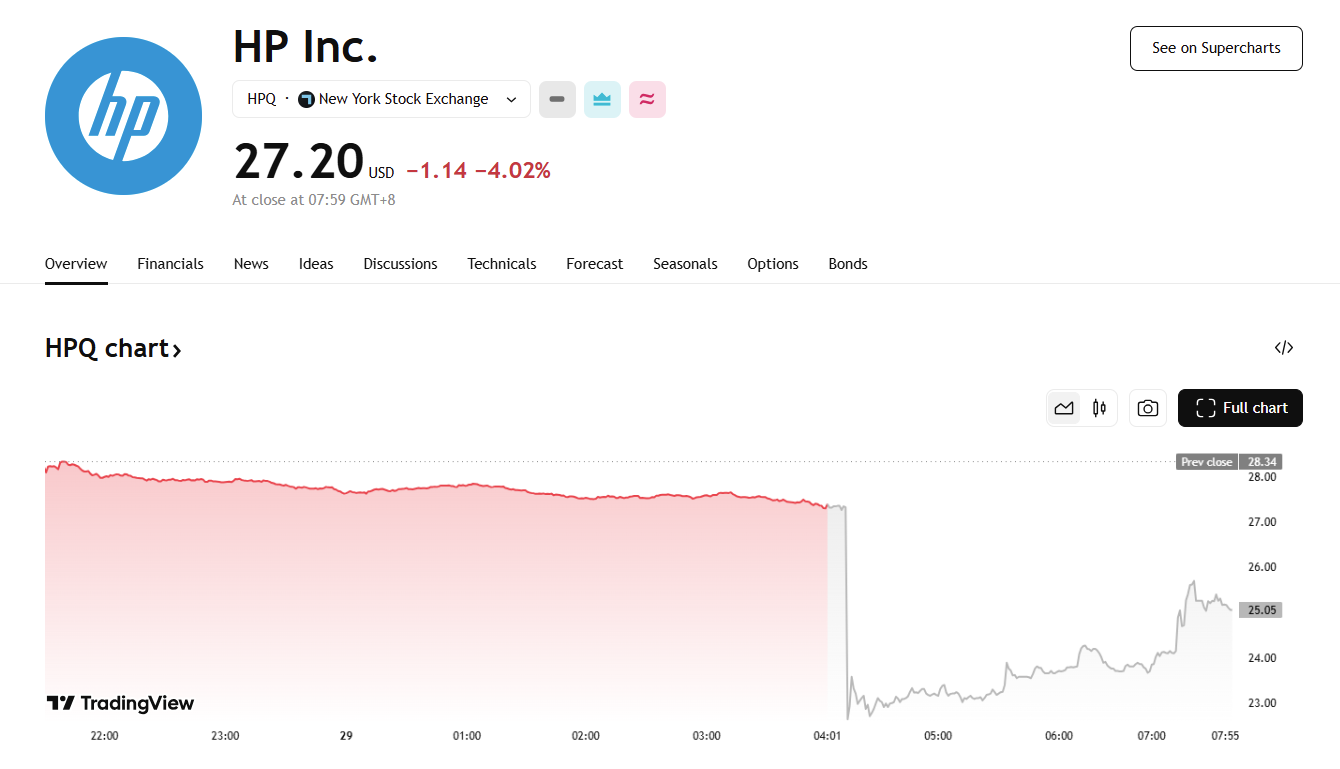 关税成本与经济疲软成双重拖累,惠普业绩指引疲软股价跌 15%