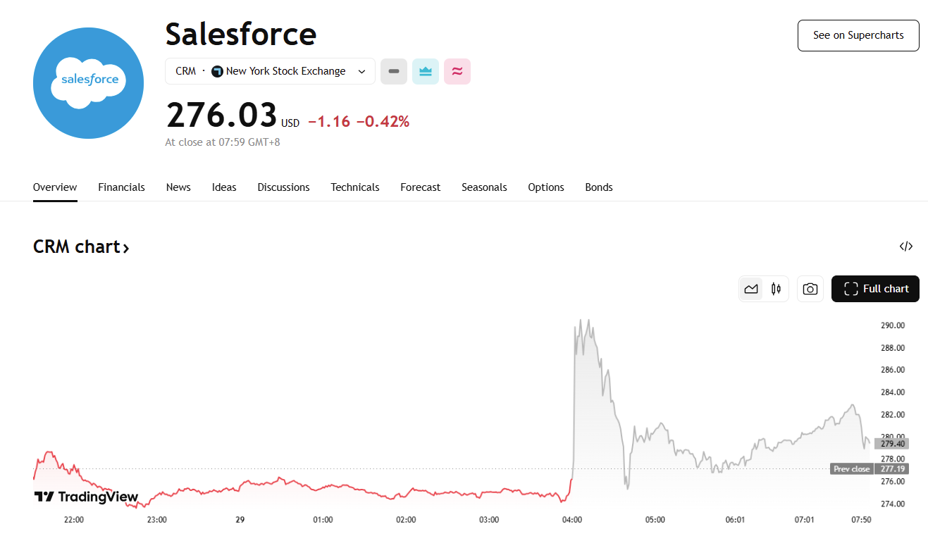 财报公布后,Salesforce 美股盘后一度涨 5.79%,随后涨幅收窄。