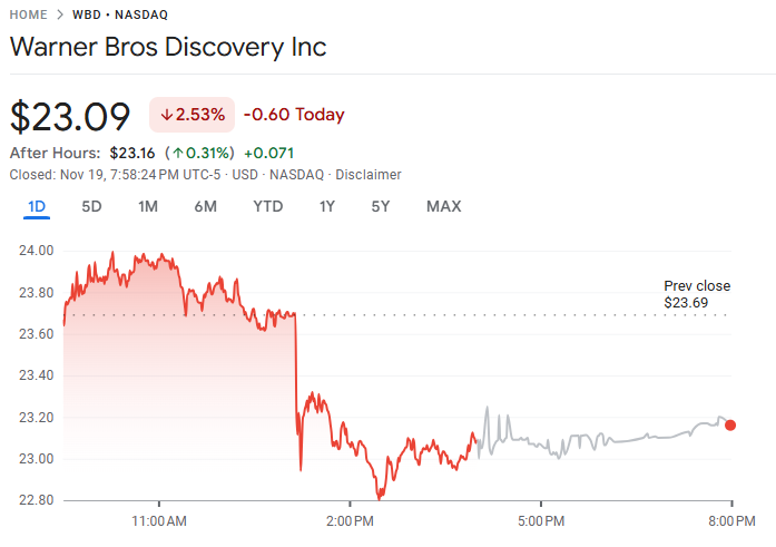 华纳收购报价未见突破,WBD 股价下跌 2.5%