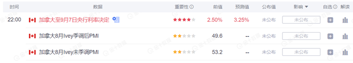北京时间 9 月 7 日 22:00,加拿大央行将公布利率决议,货币市场倾向于央行将加息 75 个基点,这将使政策利率达到 3.25%。这也将是今年第四次大幅度加息,使得 3 月以来开始的紧缩政策达到加息 300 个基点的规模。