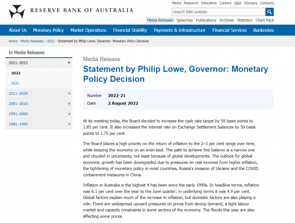 北京时间 8 月 2 日 12:30,澳大利亚央行宣布加息 50 个基点至 1.85%,符合市场预期,这是该央行连续第四次加息。