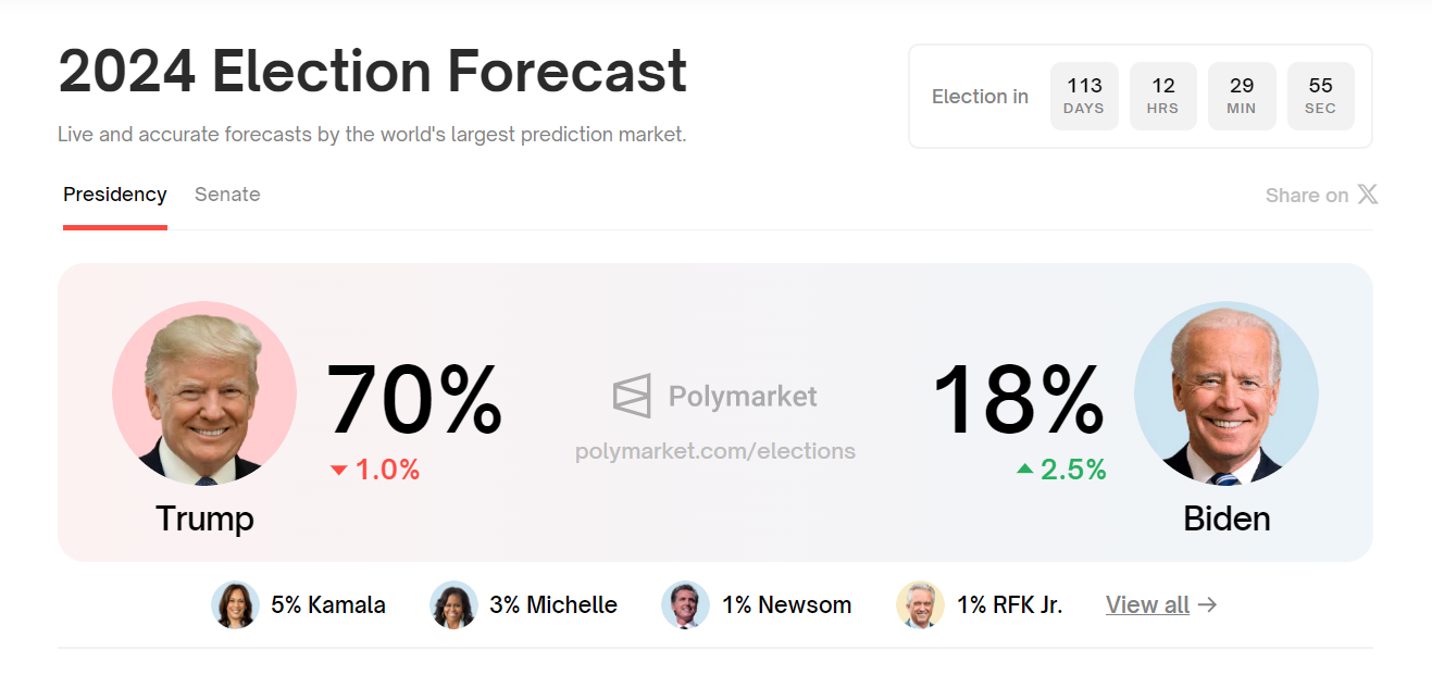 在此次袭击事件发生前,许多美国民调显示,因为拜登上个月灾难性的辩论表现,特朗普在全国和摇摆州的民调中都持续领先于拜登。而在特朗普遭遇枪击事件之后,他本已领先的大选支持率迅速上升,民调显示特朗普赢得 2024 总统选举的概率从 60% 大幅上升至 71%。