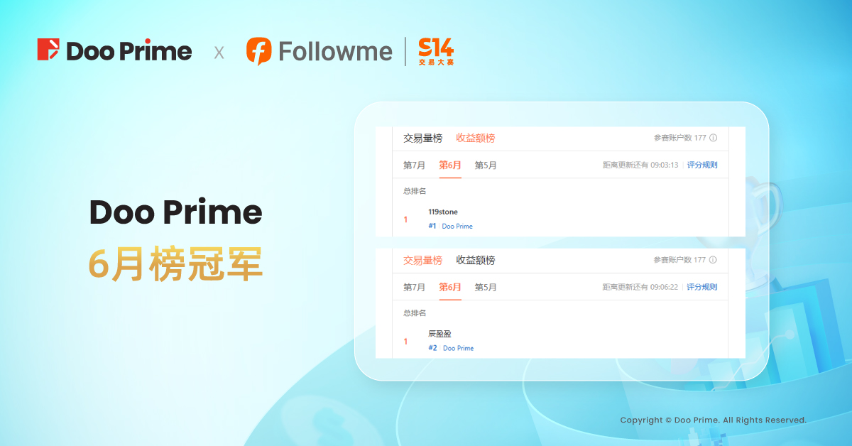 作为 FOLLOWME S14 交易大赛钻石赞助商,Doo Prime 选手可在大赛期间争夺 “月收益榜” 以及“月交易量榜” 2 个单项额外月榜冠军。所有报名参赛的 Doo Prime 新老账户均自动划分至 Doo Prime 月榜,角逐榜单冠军,共同瓜分 1,200 美元额外奖励。
