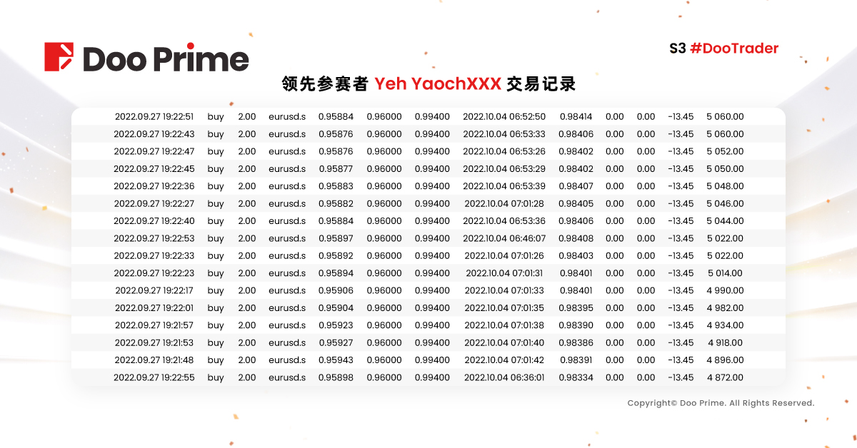 从 Doo Prime 德璞资本 S3 #DooTrader 慈善杯全球交易大赛的两个组别的赛况分析,不同的交易理念、交易手法,在这里得到了充分的碰撞和展现。目前比赛的第一轮刚好进行过半,最终鹿死谁手犹未可知,如果屏幕前的您,也想展露身手,或者想提升自我交易技能,那就赶快报名参赛吧。大赛的精彩赛况,我们会持续保持报道,请持续关注!