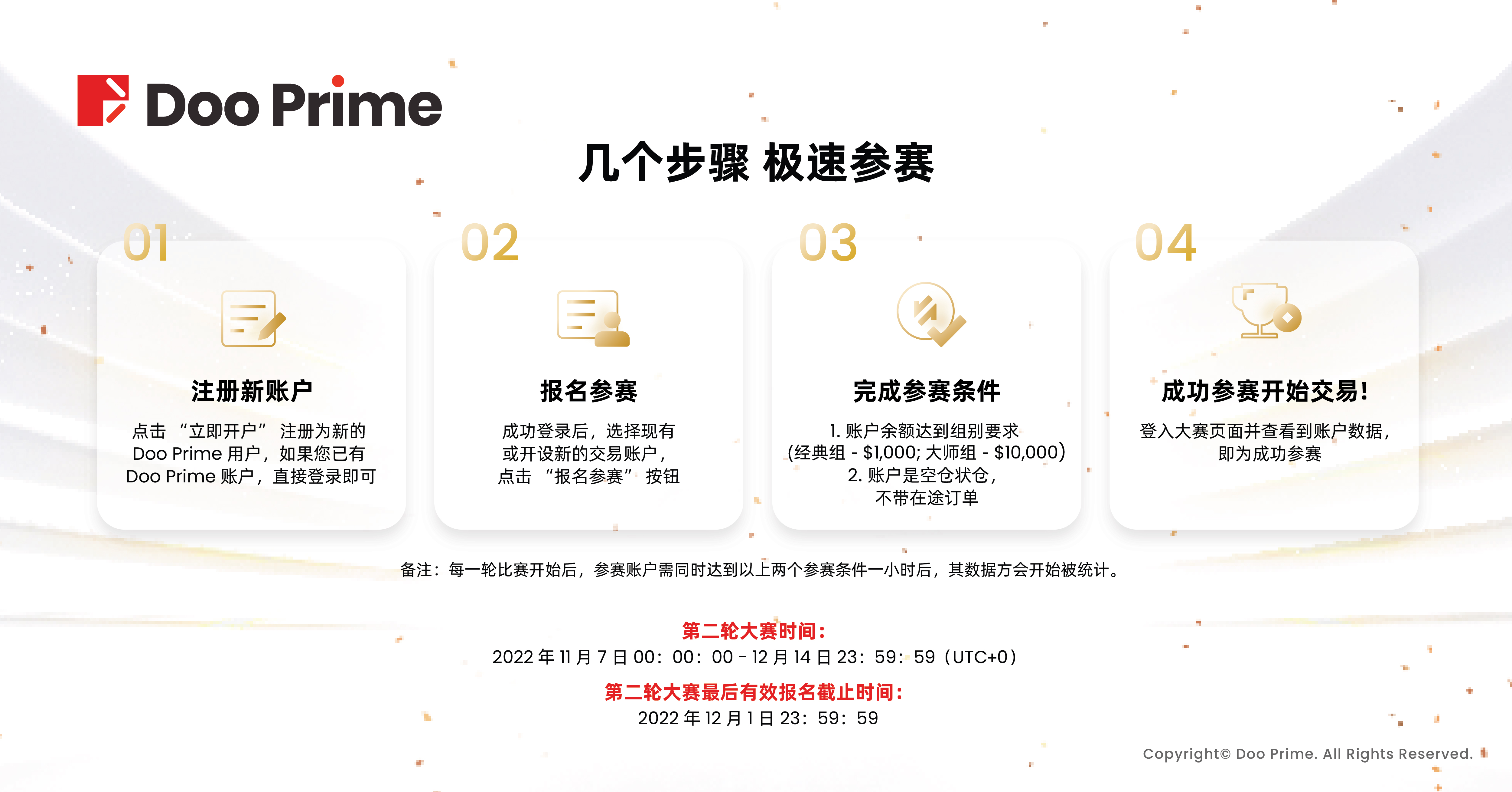 S3 #DooTrader 慈善杯全球交易大赛第一轮比赛已圆满收官,第二轮赛事于 2022 年 11 月 7 日正式启动,无论你是第一轮比赛的高手还是新一轮赛事的选手,我们都欢迎您的加入,更有 159,000 美元丰厚奖金池,期待各位选手全力以赴,巅峰对决。