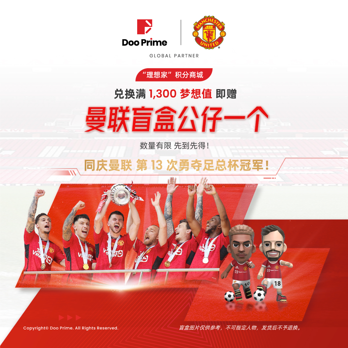 您只需在 2024 年 6 月 20 日至 6 月 30 日(UTC+8)活动期间,登录 Doo Prime 积分商城,单次兑换实体礼品满 1,300 积分,即可获赠曼联盲盒公仔一个。活动不设兑换上限,每一份符合条件的订单都可参与。每次兑换都会给您带来不一样的惊喜!感谢您一同见证了 Doo Prime 与曼联彼此的成长与辉煌。