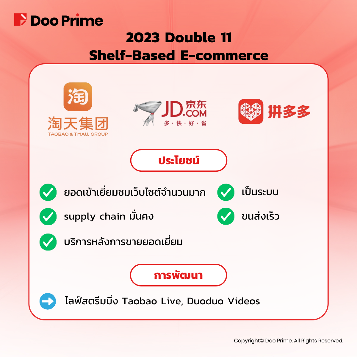 Taobao และ JD.com เป็นโมเดล Shelf-Based E-Commerce ซึ่งเน้นการจัดหาสินค้าเป็นหลัก Taobao มี supply chain ที่กว้างขวาง ซึ่งรวมถึงชื่อแบรนด์ ฉลาก และผู้ขายหลายระดับ อีกทั้ง JD.com ได้สร้างโมเดลที่ดำเนินการด้วยตนเอง โดยมุ่งเน้นสินค้าคุณภาพสูงสำหรับผู้ใช้ระดับไฮเอนด์