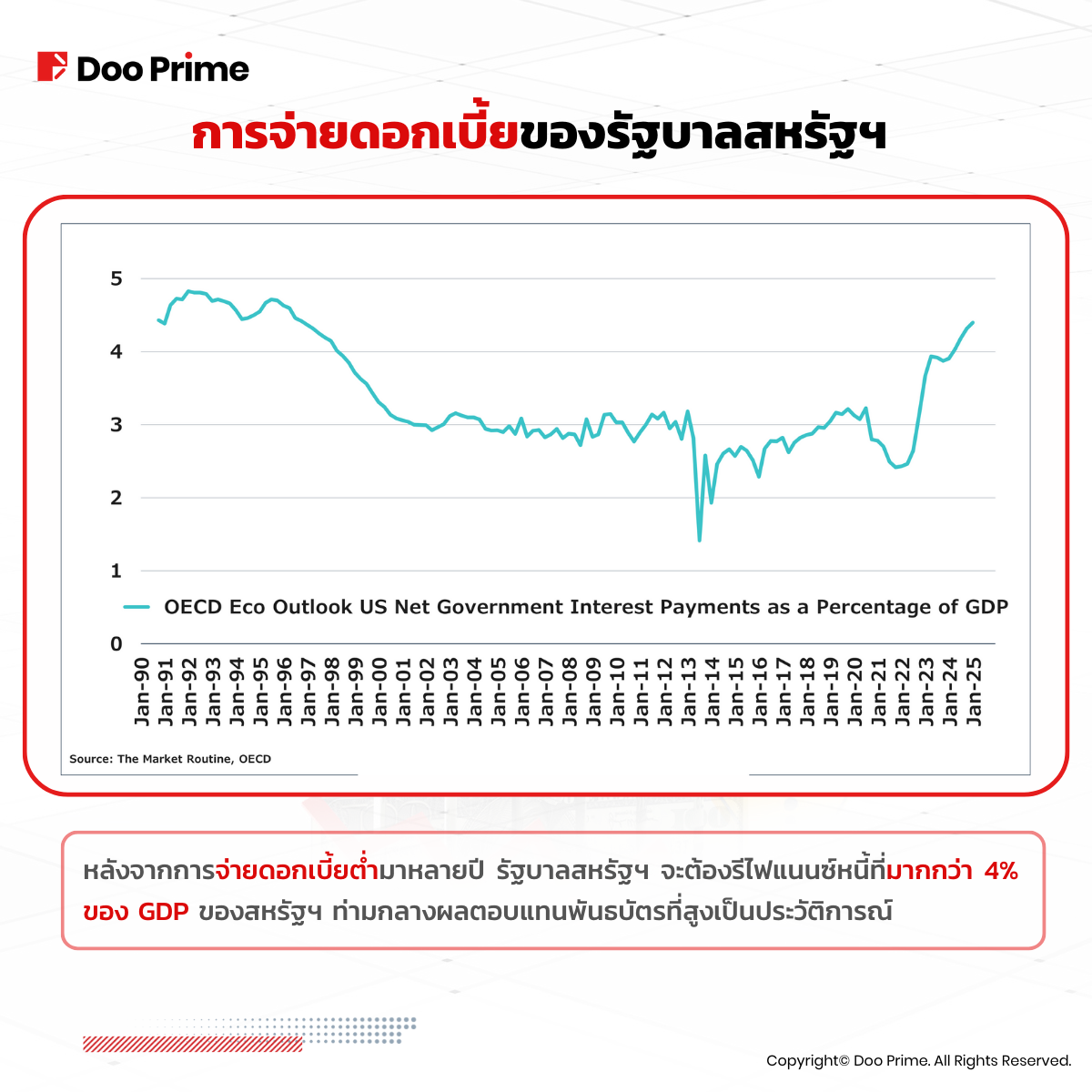 ลองคิดว่าสหรัฐฯ ต้องรีไฟแนนซ์หนี้ทั้งหมดที่อัตราผลตอบแทนพันธบัตรรัฐบาลปัจจุบัน การจ่ายดอกเบี้ยทั้งหมดจะมีมูลค่ารวมสูงถึง 1.33 ล้านล้านเหรียญสหรัฐ ซึ่งคิดเป็นมากกว่า 5% ของ GDP ของสหรัฐอเมริกา!