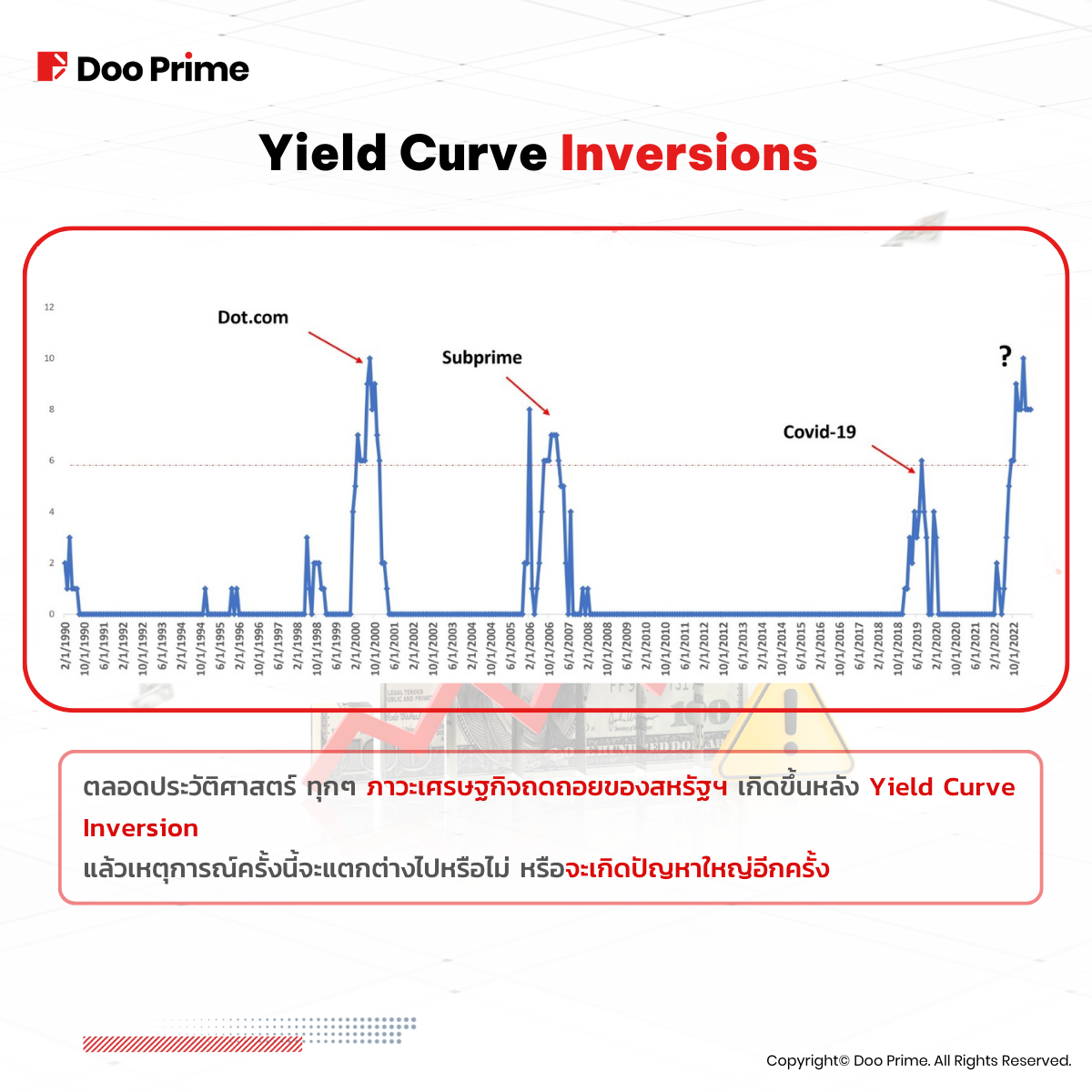 ในอดีต Yield Curve Inversion เป็นตัวบ่งบอกภาวะถดถอยที่น่าเชื่อถือ อีกทั้ง การเกิดภาวะเศรษฐกิจถดถอยทุกครั้งในสหรัฐอเมริกานับตั้งแต่ปี 1955 มีสัญญาณเตือนจาก Yield Curve Inversion ขึ้นก่อนทุกครั้ง
