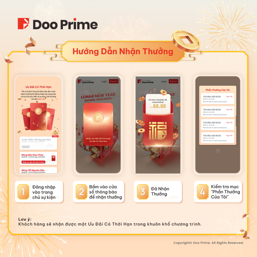 Doo Group, tổng công ty của Doo Prime, đã cho ra mắt hàng loạt các chiến dịch ưu đãi hấp dẫn trong xuyên suốt các kỳ lễ hội lớn trên khắp thế giới. Nhằm tri ân quý khách hàng thân thiết – những người đã đồng hành cùng chúng tôi trong suốt thời gian qua, Doo Prime đã triển khai nhiều chương trình ưu đãi và chiết khấu cực “cool”. Trên cơ sở đó, chúng tôi hy vọng sẽ thắt chặt mối quan hệ hợp tác với quý khách hàng trong dịp Tết đến, Xuân về vào mỗi năm. Trong thời gian tới, Doo Prime cam kết sẽ tích cực thực hiện sứ mệnh của mình thông qua việc cung cấp hệ thống sản phẩm – dịch vụ tài chính an toàn, thuận tiện và chuyên nghiệp, song song với việc đem đến nhiều trải nghiệm thú vị cho các nhà đầu tư trên toàn cầu.