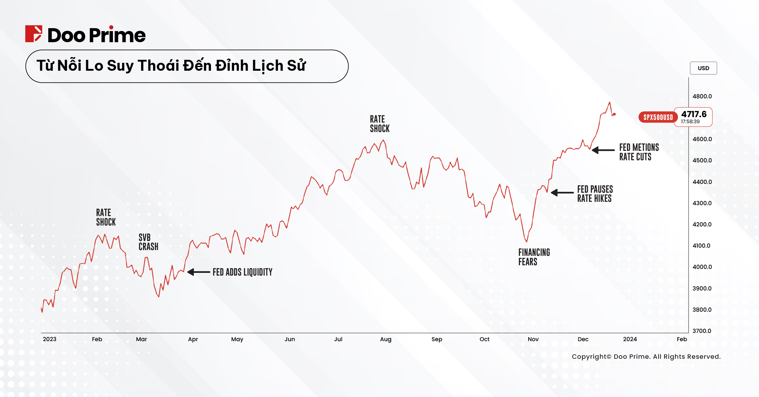 Fed đã phải thay đổi chính sách tiền tệ của họ. Họ đi từ lập trường “cao hơn trong thời gian dài hơn” đến “tạm dừng tăng lãi suất” rồi cuối cùng là “cắt giảm lãi suất vào năm 2024”. Đây là những sự thay đổi đáng kể trong một thời gian rất ngắn của Fed.